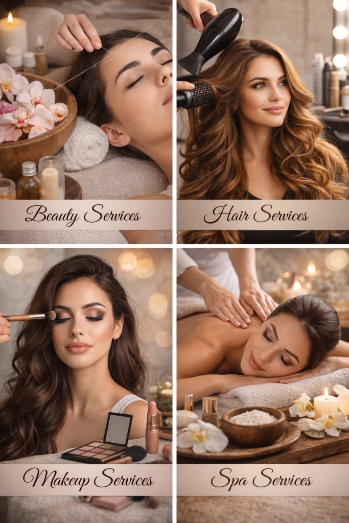 Our salon offers a wide range of professional services including beauty treatments, advanced hair care, bridal and party makeup, and therapeutic spa therapies. Each service is delivered by trained experts using high-quality products, modern techniques, and personalized care tailored to your needs.
